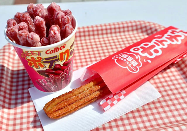 「Calbee+」は、ポテトを使ったホットスナックが楽しめるお店です。紅芋を使用した「スイートポテりこ」や「ポテチュロ 黒糖味」は沖縄国際通り店でしか味わえない限定商品。